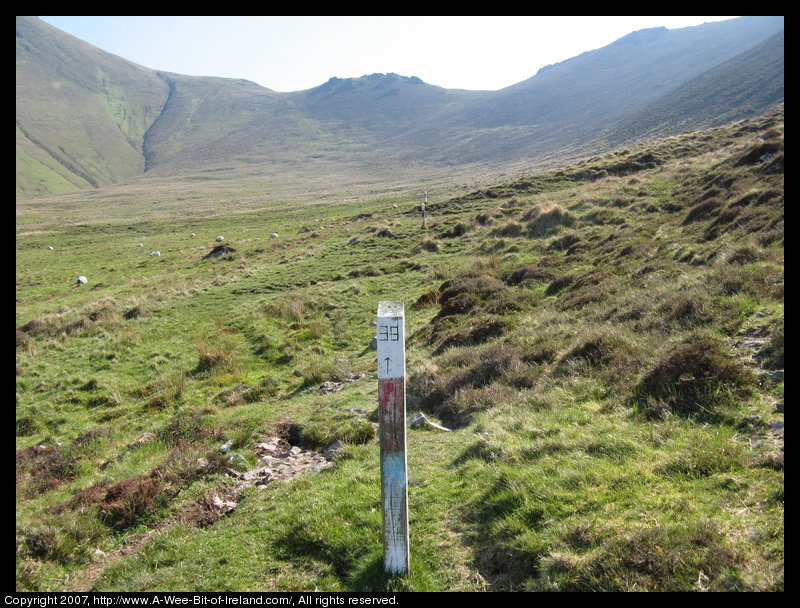 Caherconree Mountain in County Kerry. I walked up to the promontory fort on May 3, 2007. Here is the first marker on the path to the fort.