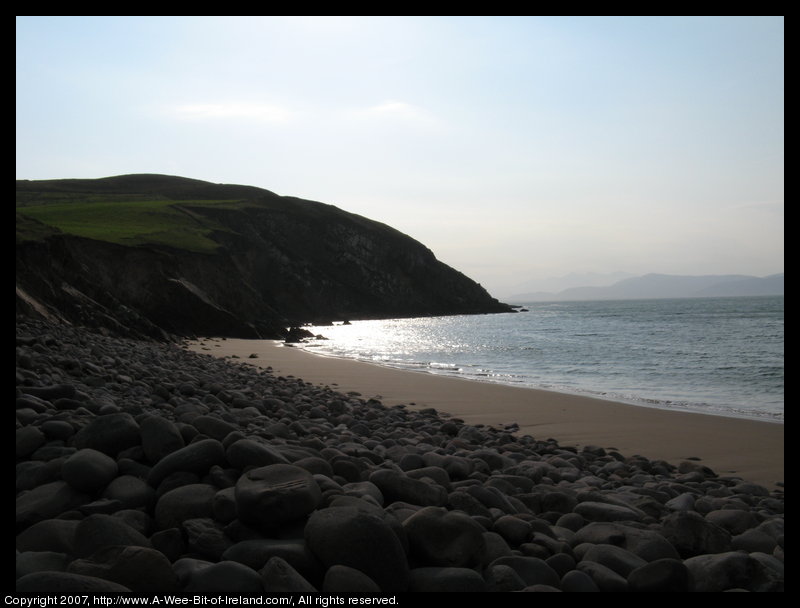 This is the boulder beach next to Minard Castle. There is a ring fort on the hill above the beach (shown in the zoomed in view at the bottom of this page). This place has been fortified for a very long time.