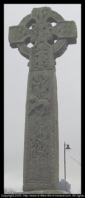 These are photos of the Celtic high cross at Drumcliff. The carvings on the cross are of biblical scenes such as Adam and Eve. St. Colmcille (St. Columba) founded a monastery here. The round tower across the road and the high cross survive from the monastery. The round tower was built between 900 and 1200. The high cross may be from 1100. Columcille was born in 521 and moved to Iona in 563 and died in 597. I photographed this Celtic high cross again in 2007.